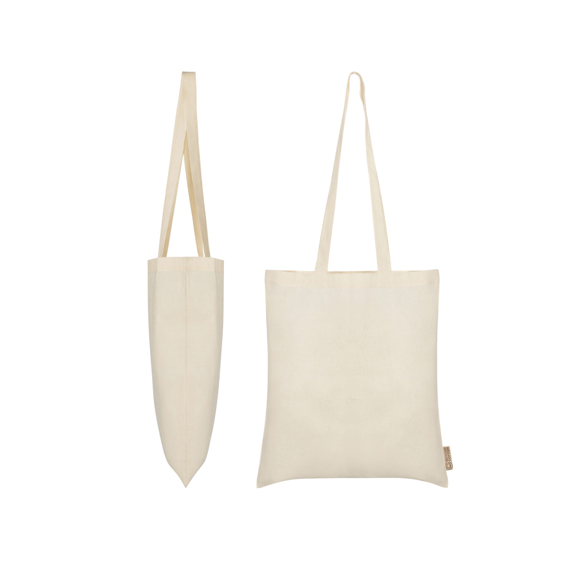 Bolsa combinada 70% algodón reciclado 30% poliéster reciclado de 140 g/m². Asas largas de 70cm.