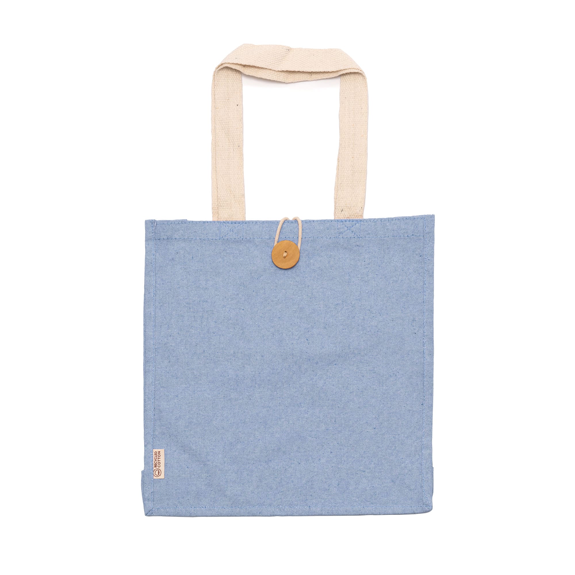 Bolsa de algodón reciclado con acabado jaspeado. Asas largas reforzadas de 70 cm. Cierre con botón.