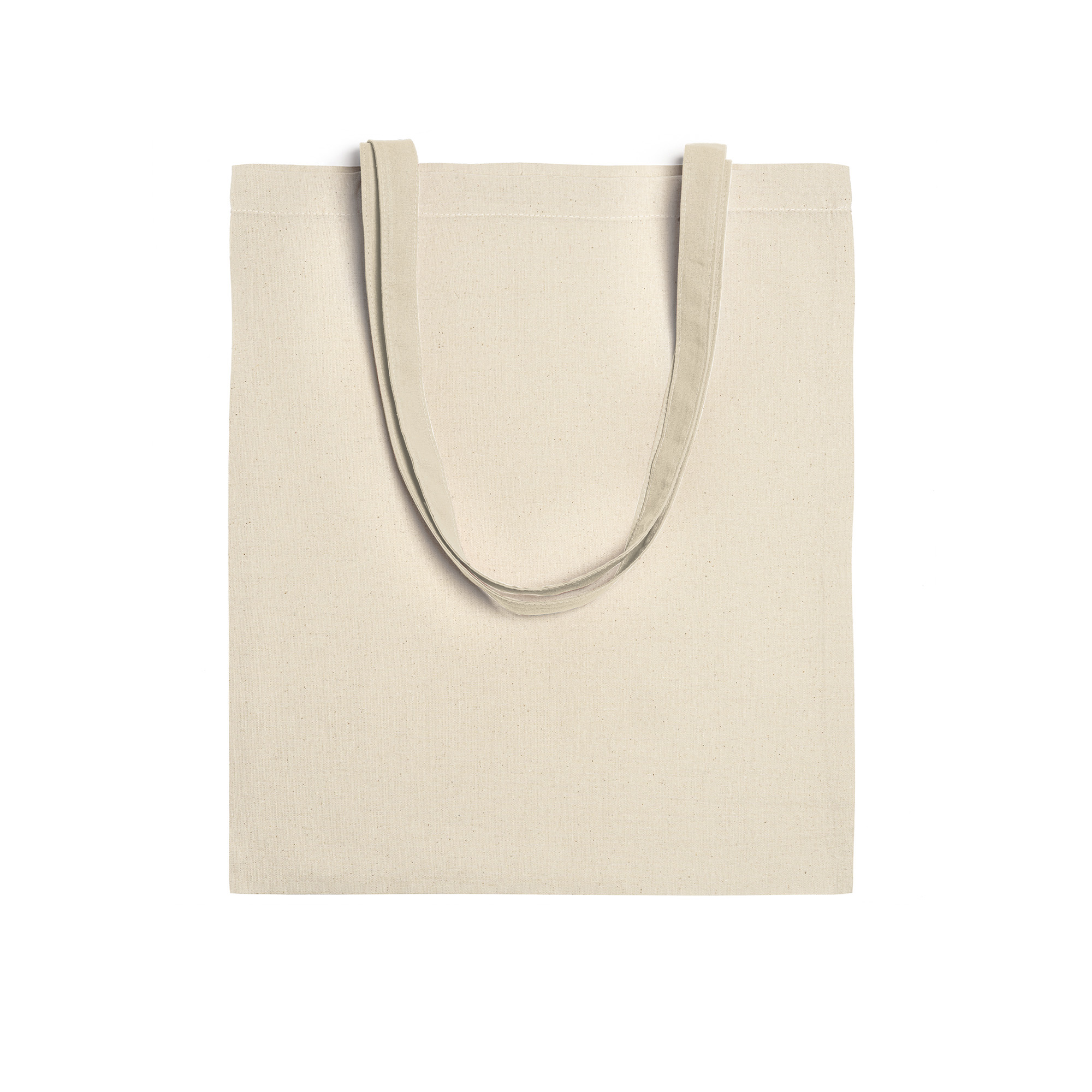Bolsa fabricada en tejido de algodón en color natural, con asa larga de cinta en el mismo color.