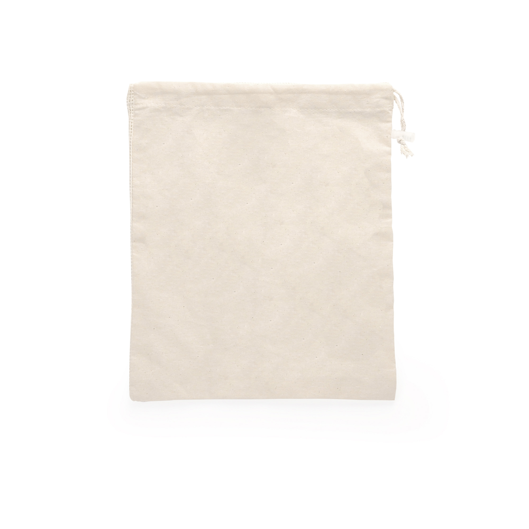 Bolsa multiusos ideal para la compra, de línea eco 100% algodón 120 g/m². Color natural. Un lado de la bolsa en algodón suave y otro lado en ligera rejilla. Cierre de cordón y ajustador de plástico transparente.