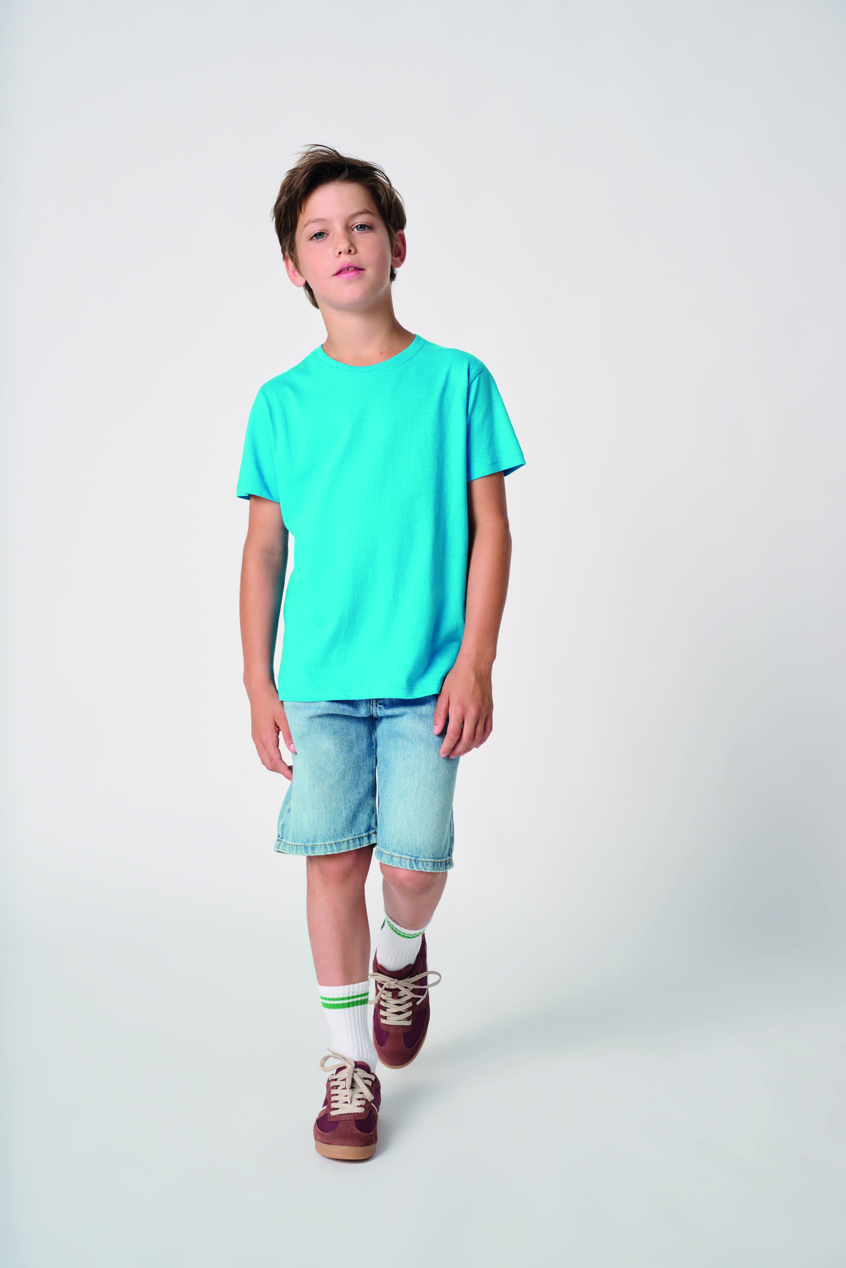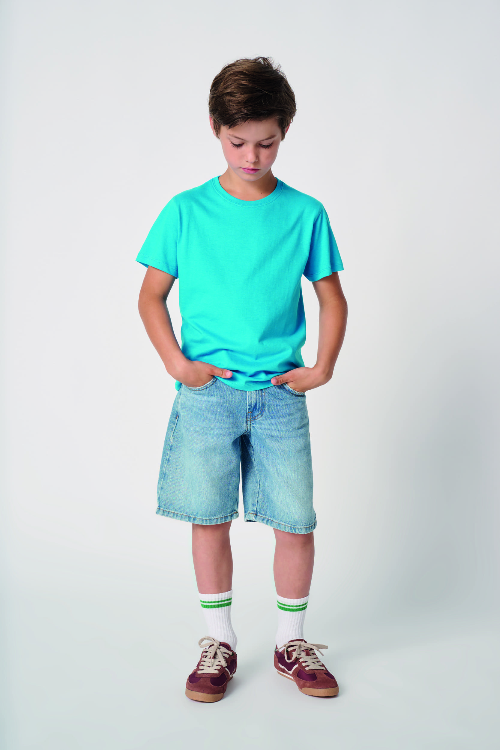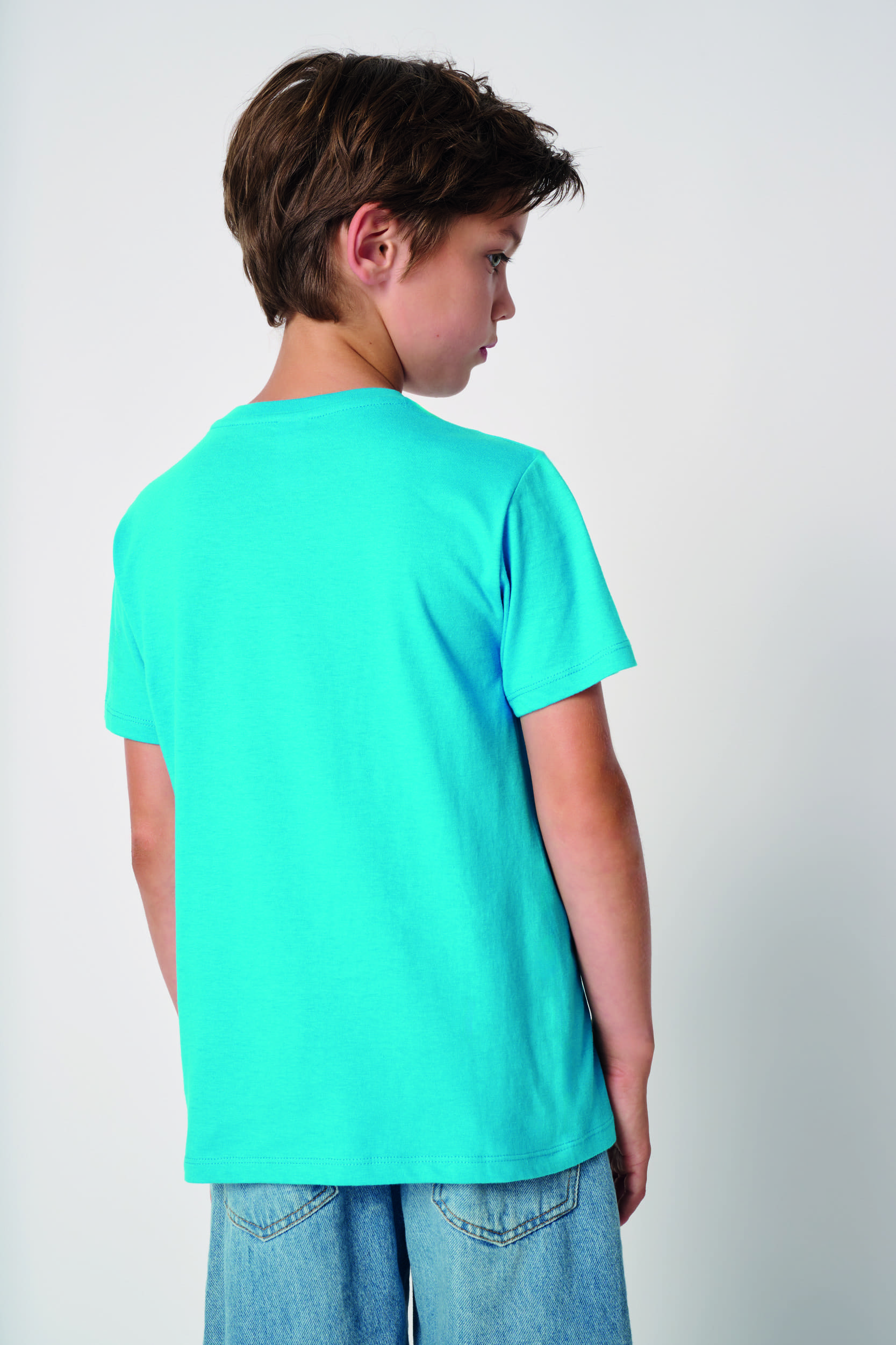 Colores lisos: 100 % algodón. Color Ideal Ash Heather: 99% algodón / 1% viscosa. Color Ideal Oxford Grey: 90% algodón / 10% viscosa. Tejido de punto jersey cortado y cosido desde la talla 1/2 hasta la 6/8 y tubular desde la talla 8/10 hasta la 12/14. Corte recto. Cuello redondo con canalé 1x1 y doble pespunte. Tira cubrecosturas en el interior del cuello a tono. Bajo de las mangas y de la prenda con doble pespunte. Etiqueta de marca extraíble.