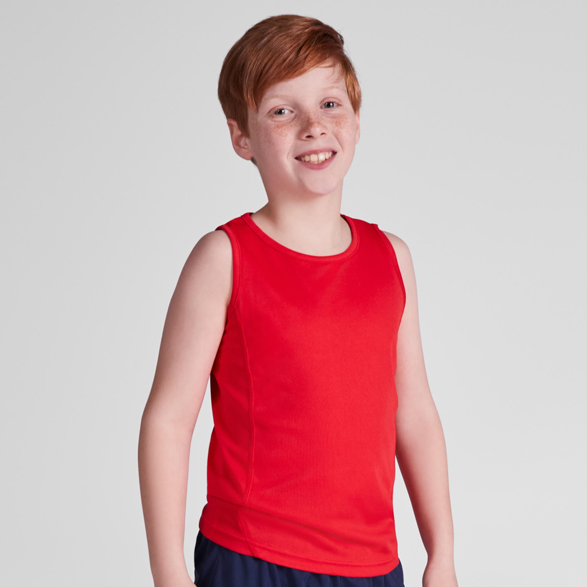 Camiseta técnica tirantes transpirable para niño. Sisas y cuello ribeteados en el mismo tejido. Costuras remalladas al tono. Pieza en bajo espalda con forma curva que se adelanta a la parte inferior del frontal. Certificado UV.