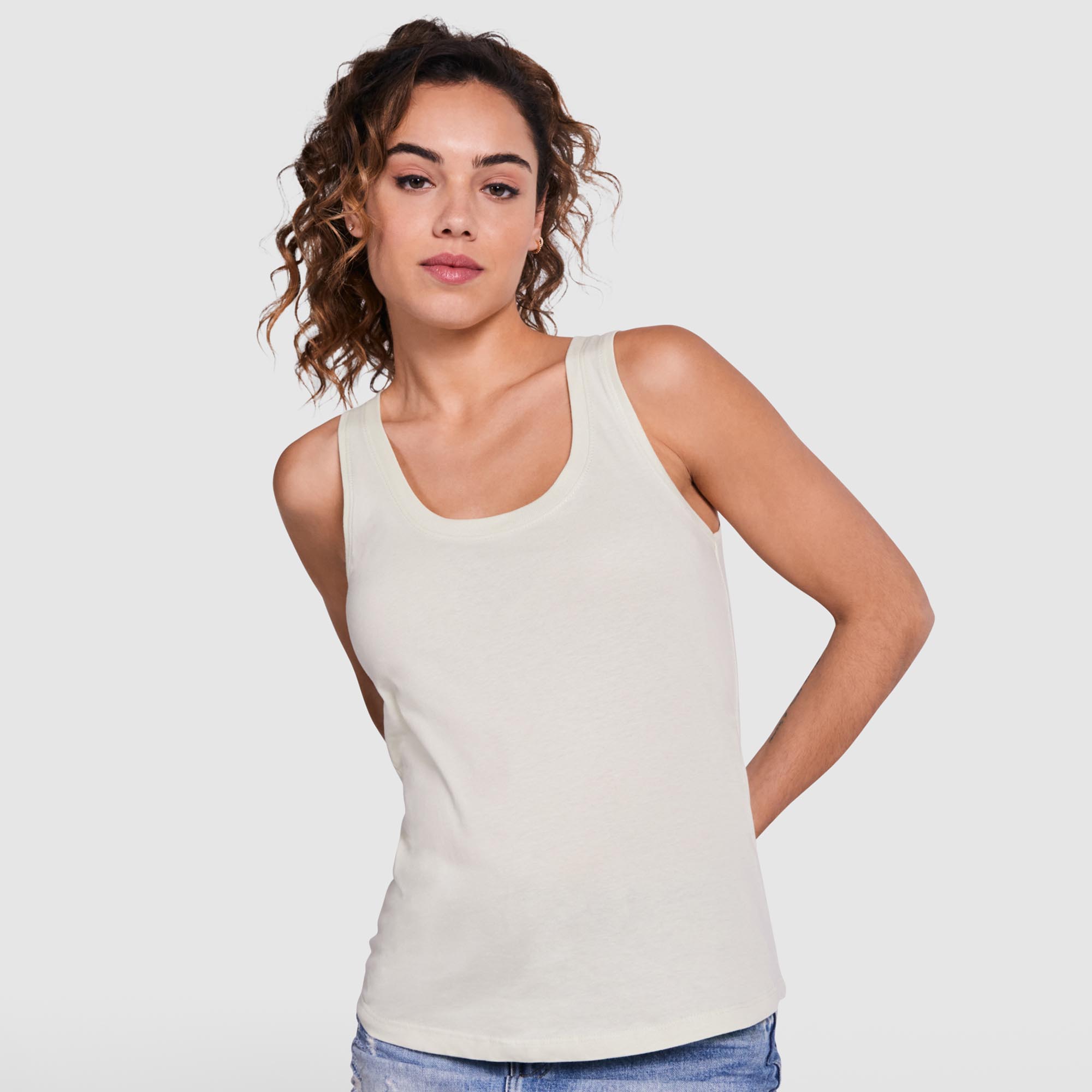 Camiseta de tirantes ancho de corte holgado. Cuello redondo y sisas en canalé 1×1. Bajo en forma redondeada. Cubrecosturas en cuello del mismo tejido.