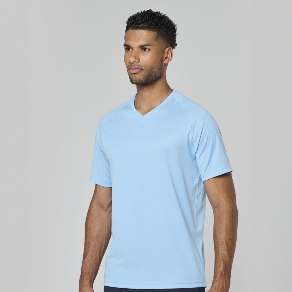 • Cuello en pico: Ofrece un toque más moderno y elegante. Ideal para camisetas premium o de uso diario, especialmente en públicos adultos.