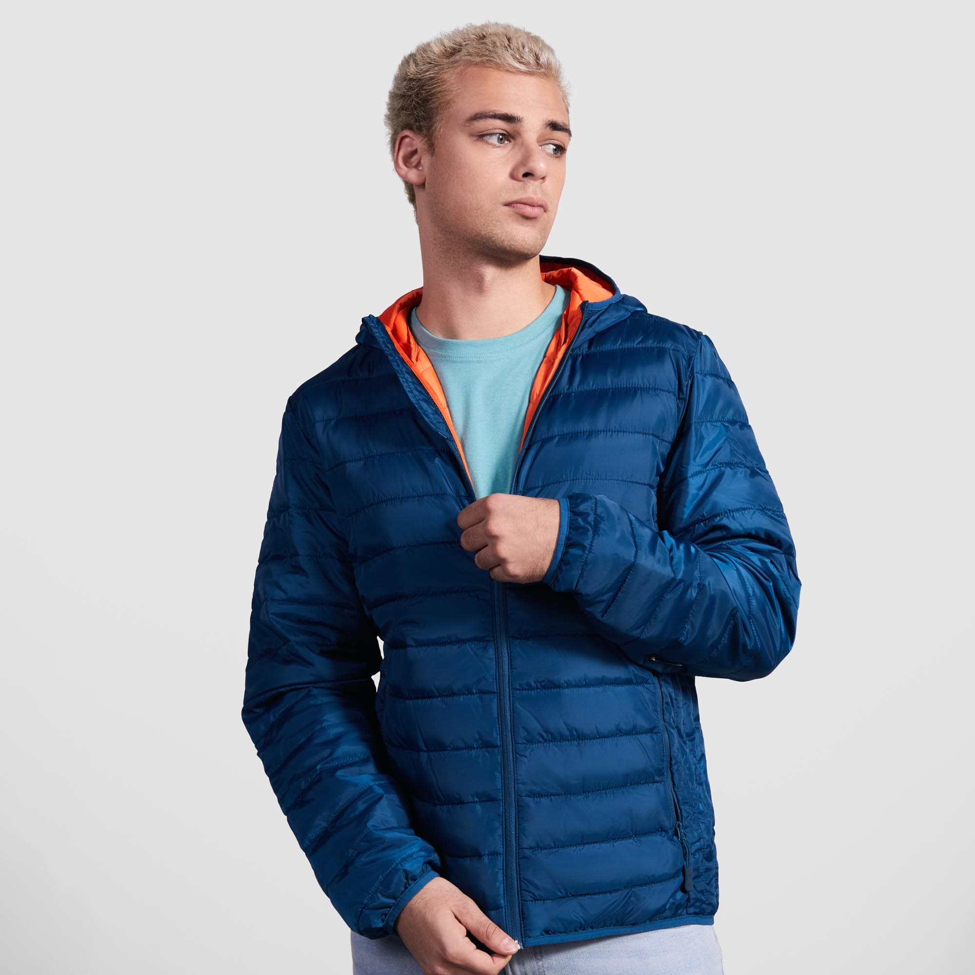 Chaqueta con capucha acolchada resistente al agua. Cremallera frontal invertida al tono con protector de barbilla del mismo tejido. Bolsillos laterales con cremalleras invertidas al tono insertados en los paneles laterales. Vivo elástico al tono en contorno de capucha, puños y bajo. Opción de colores lisos o a contraste en interior.