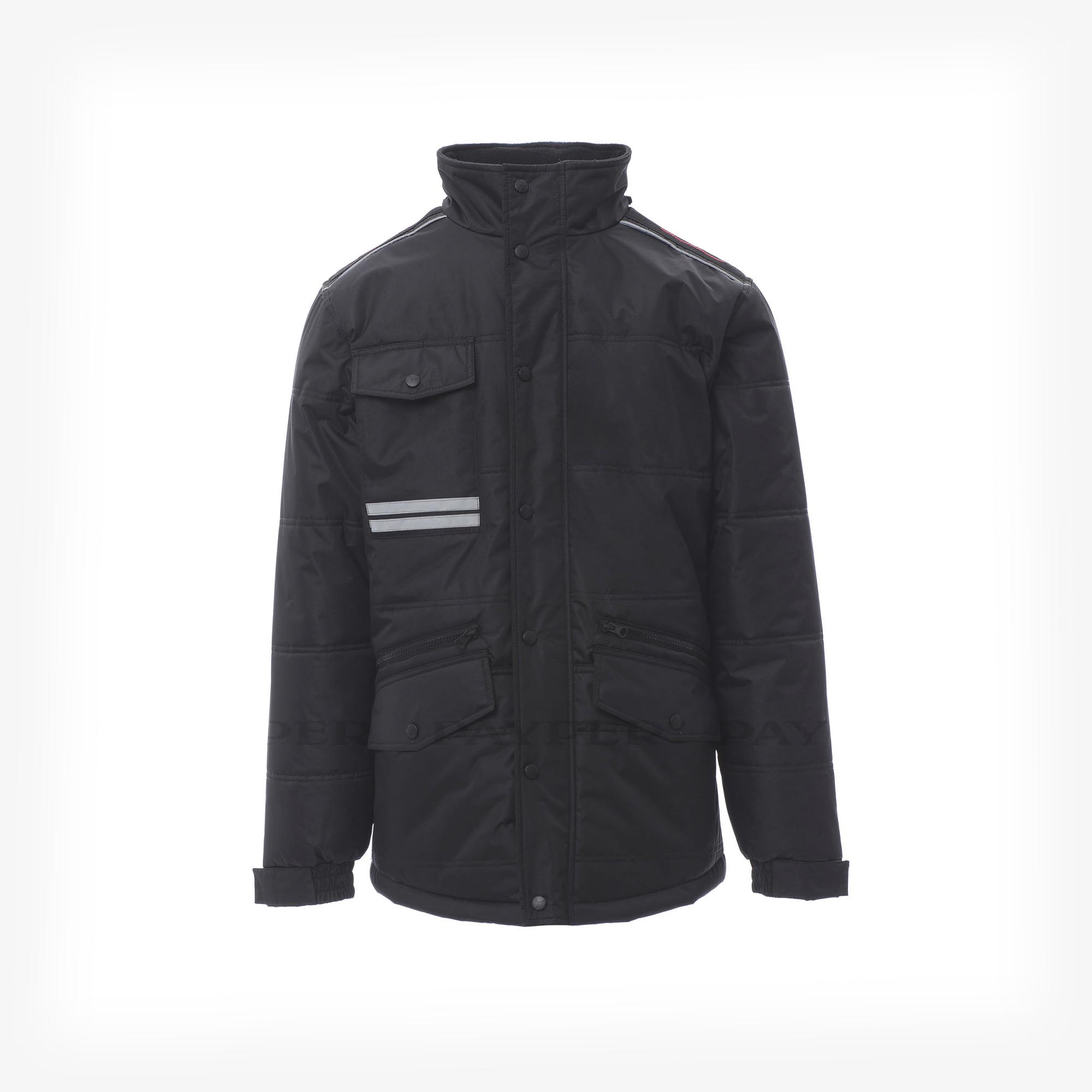 Chaqueta 3/4 para hombre, cremallera de 8 mm de plástico con cursor de metal con tapeta y botones de plástico, parte posterior contorneada y con capucha plegable en el cuello, dos bolsillos exteriores LOCK SYSTEM y dos bolsillos con cremallera