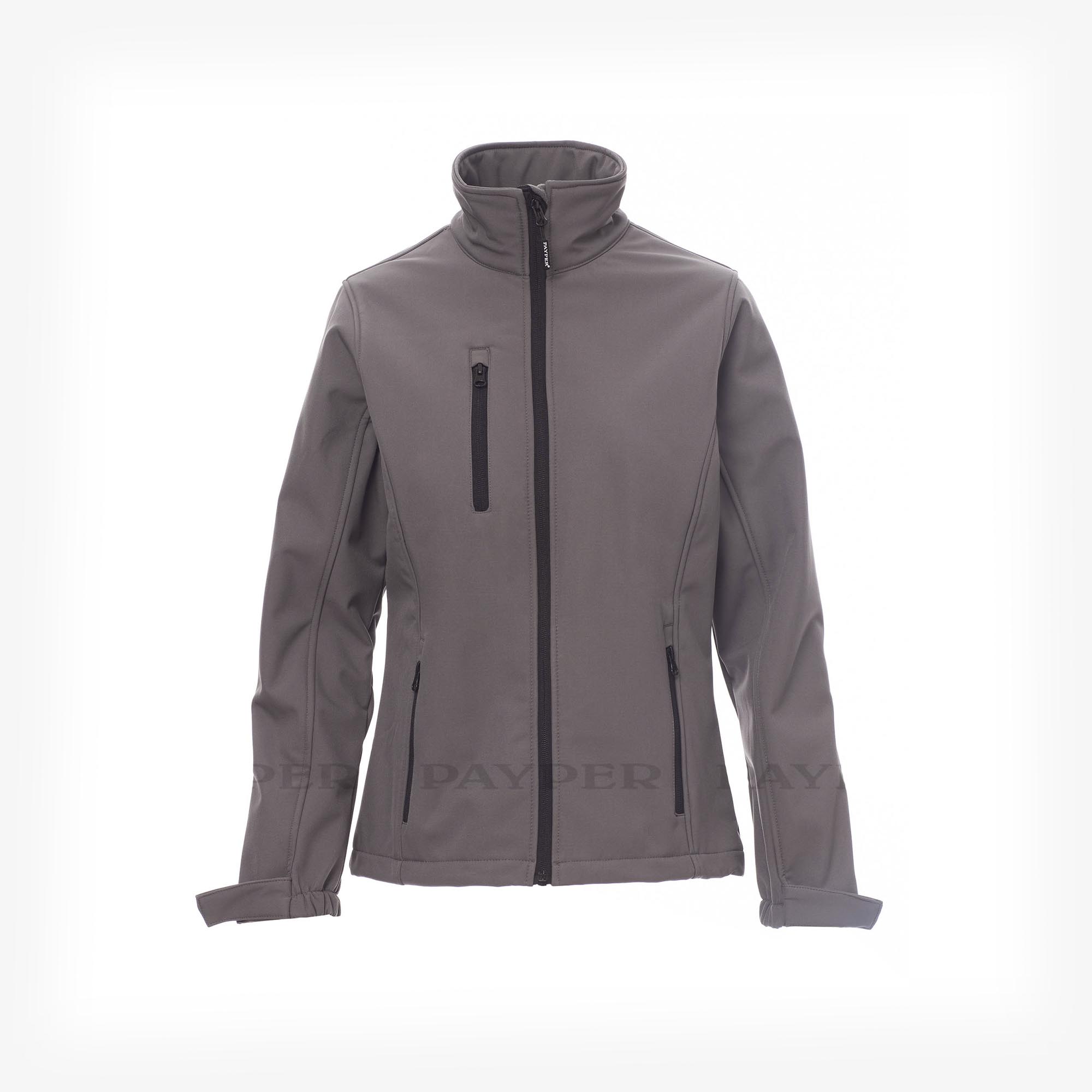 Soft-shell de tres capas, de mujer, cierre de cremallera SBS con cinta. Puños elásticos ajustables con cierre de gancho y bucle. Dos bolsillos exteriores con cremallera.