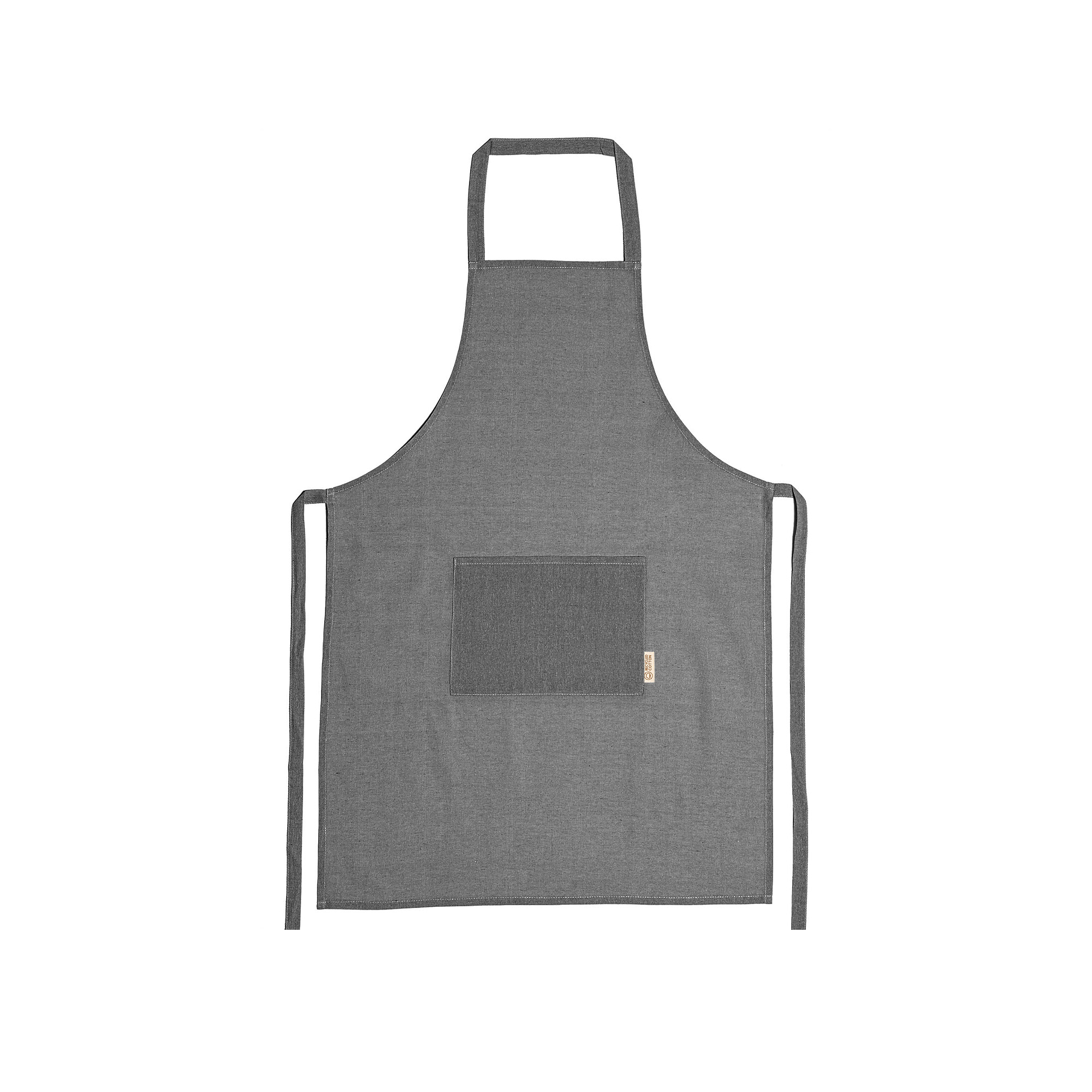 Delantal realizado en algodón reciclado con acabado jaspeado. Bolsillo frontal. Talla única ajustable.