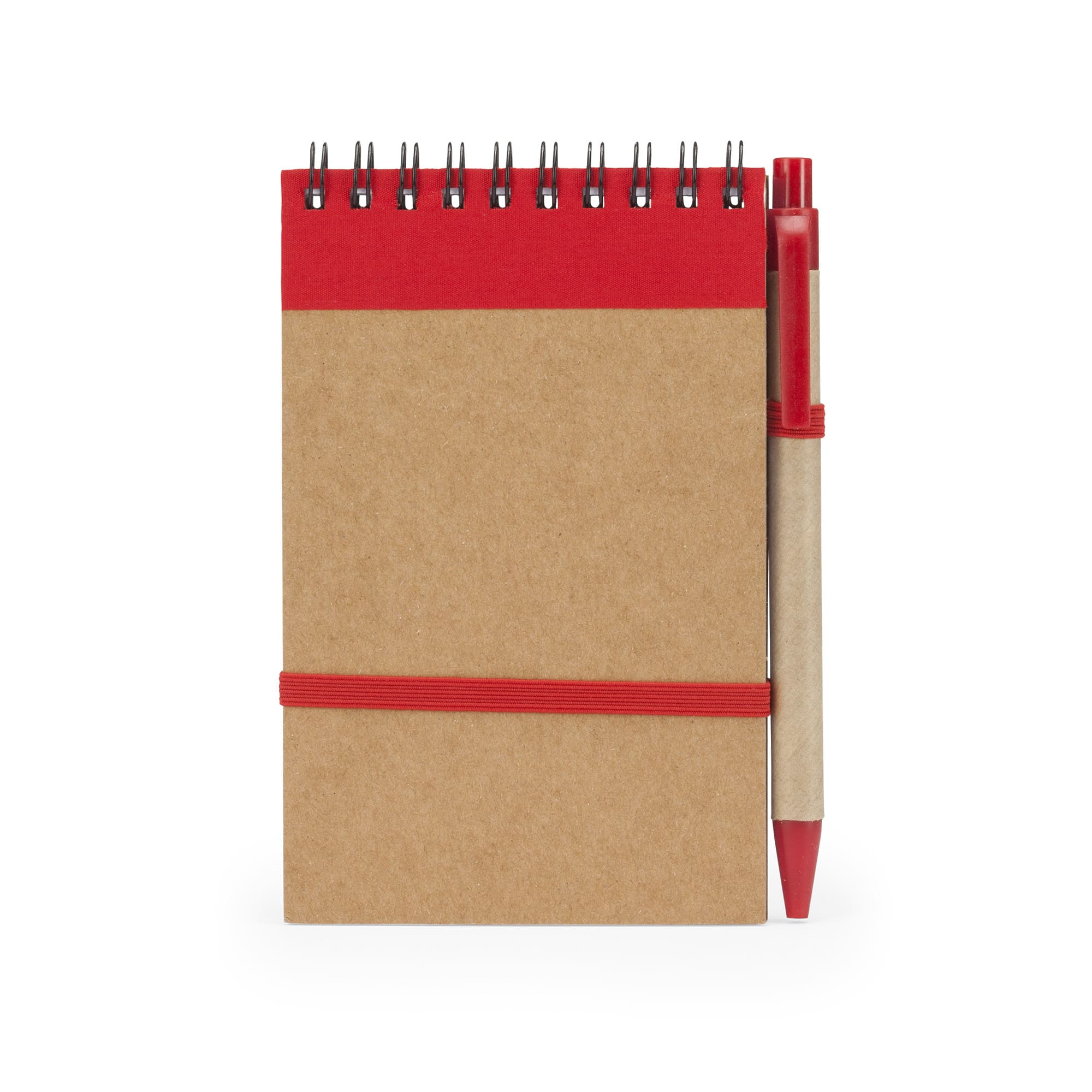 Libreta con espiral y tapa rígida de cartón reciclado. Incluye bolígrafo a juego con tinta azul. 70 hojas.