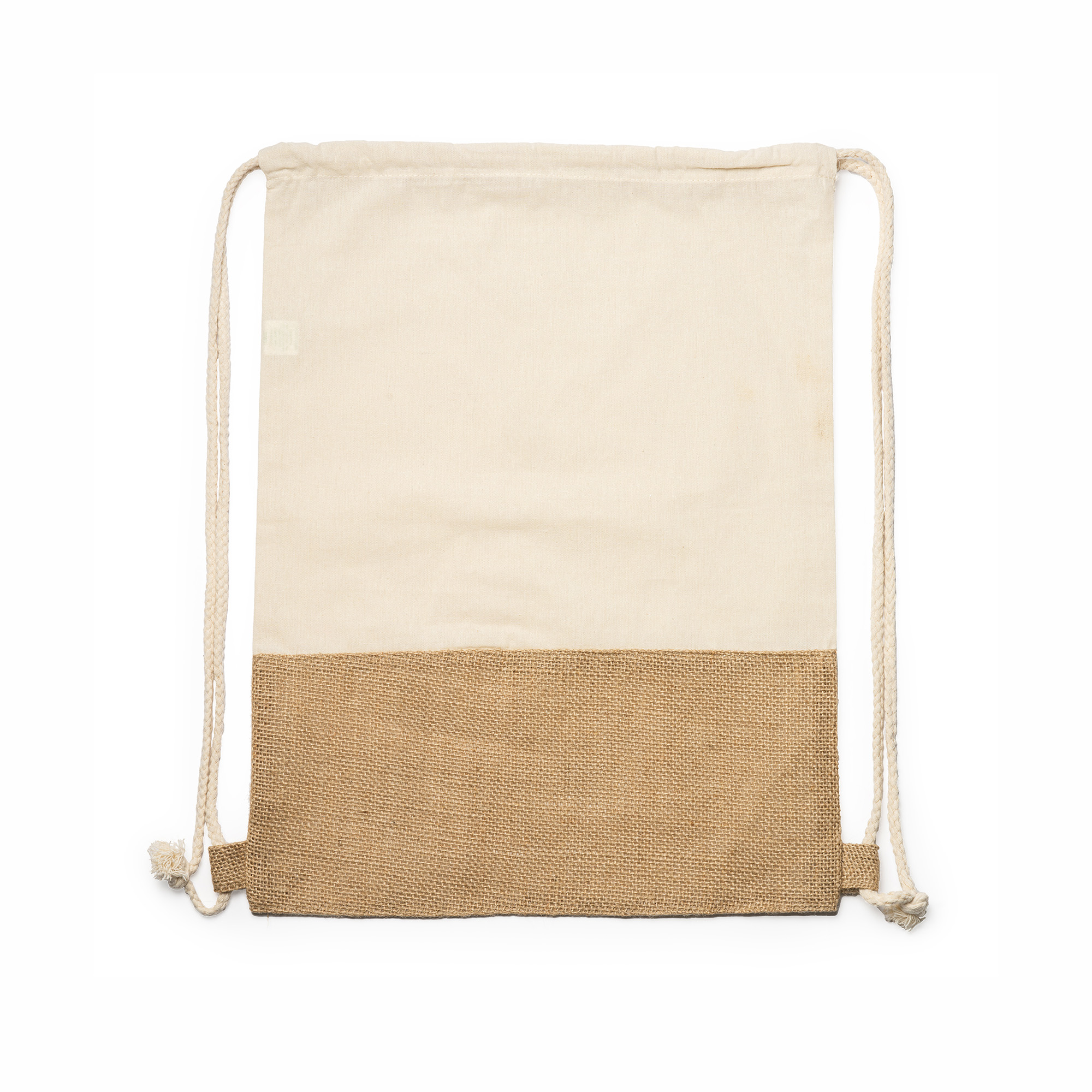 Mochila de cordones línea eco de algodón de 120 g/m² y yute. Color natural. El frontal de la mochila presenta una banda de yute en la parte inferior. Cordones cosidos a ambas esquinas inferiores.