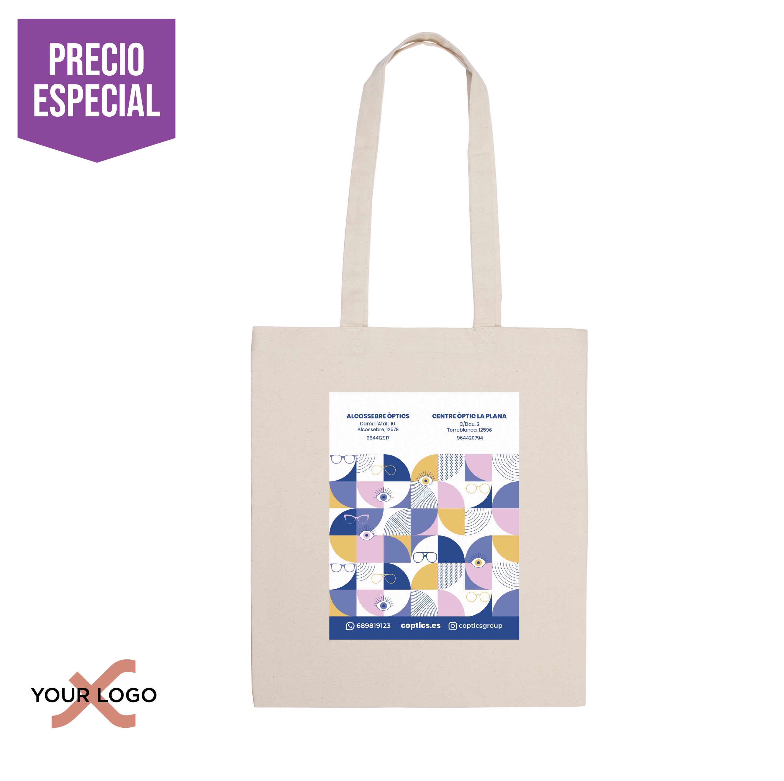 Tote bag de 100% algodón color natural, ideal para eventos, ferias, promociones o regalos. Personalizable a una cara con impresión digital a todo color, económica y disponible desde pocas unidades.