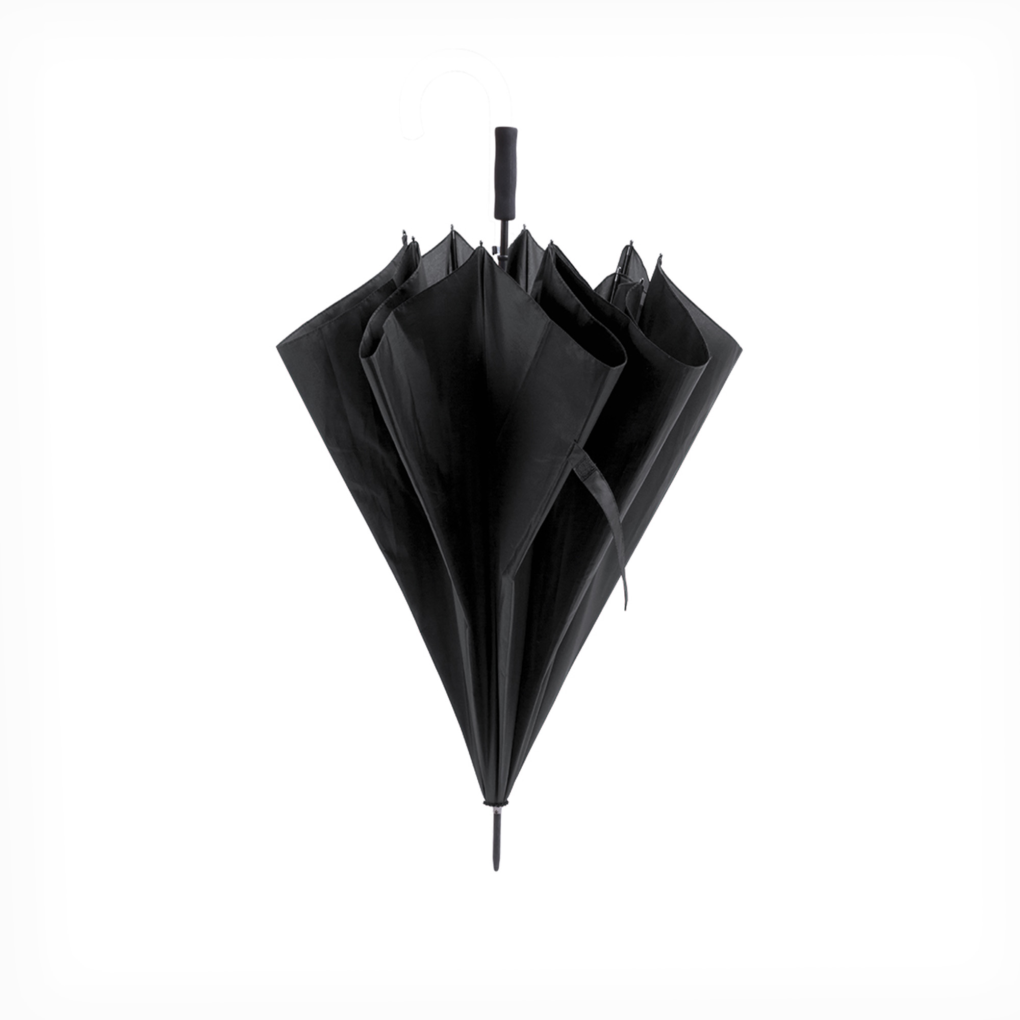 Paraguas de 8 paneles tamaño XL -130cm diámetro- con sistema antiviento. Apertura automática. en resistente poliéster y con varillas de fibra en color negro. Con mango acolchado de EVA y cierre de velcro. Disponible en extensa gama de colores.