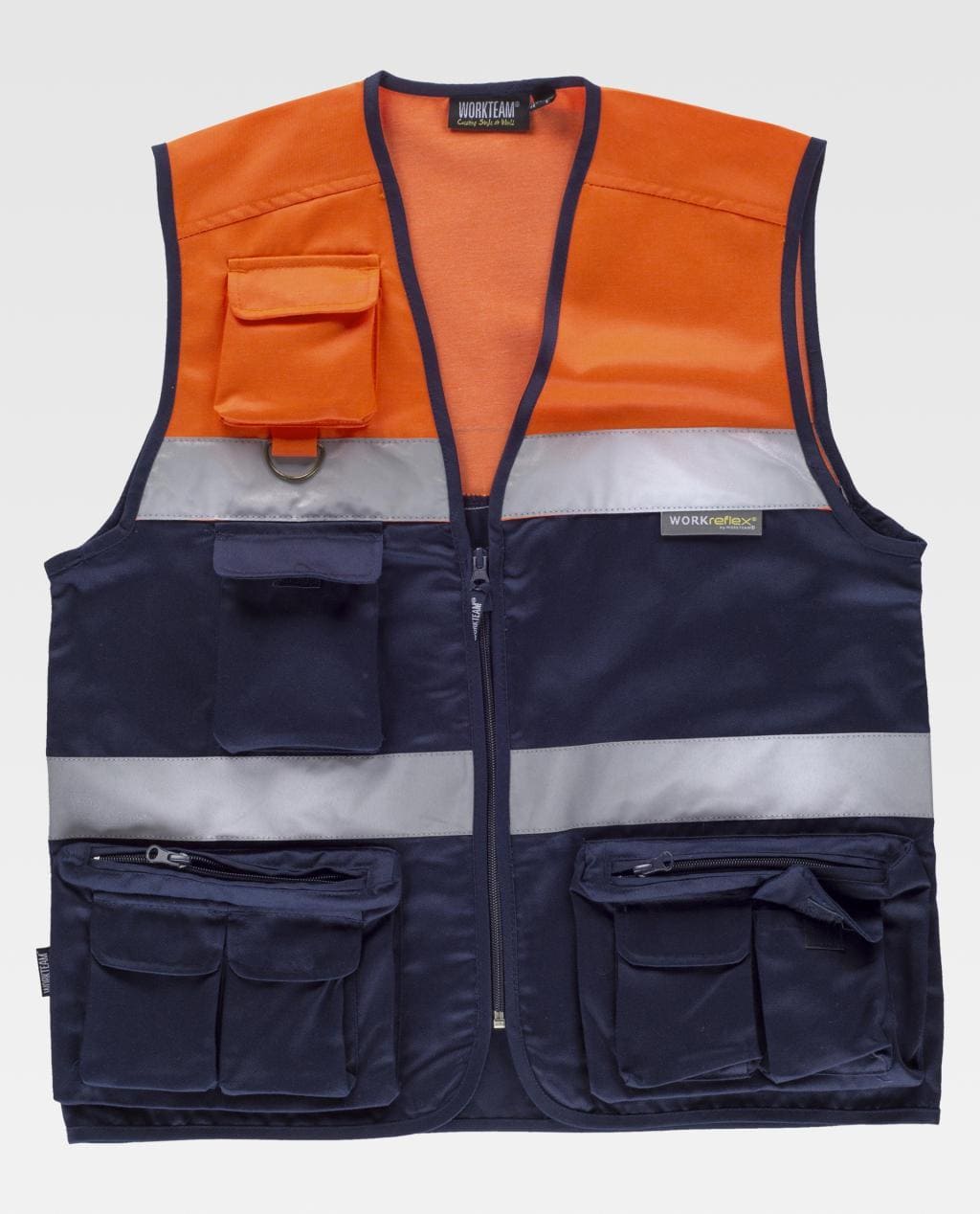 Chaleco tipo safari combinado con cintas reflectantes. Parte superior de alta visibilidad. Escote a pico y cierre de cremallera de nylon. Dos bolsos de pecho de distinto tamaño con fuelle y cartera de velcro. Argolla metálica en el bolsillo superior. Dos bolsos laterales con fuelle y cierre de cremallera. Bolsillos auxiliares superpuestos con cartera de velcro. Dos cintas reflectantes en pecho y espalda. Ribeteado con bies.