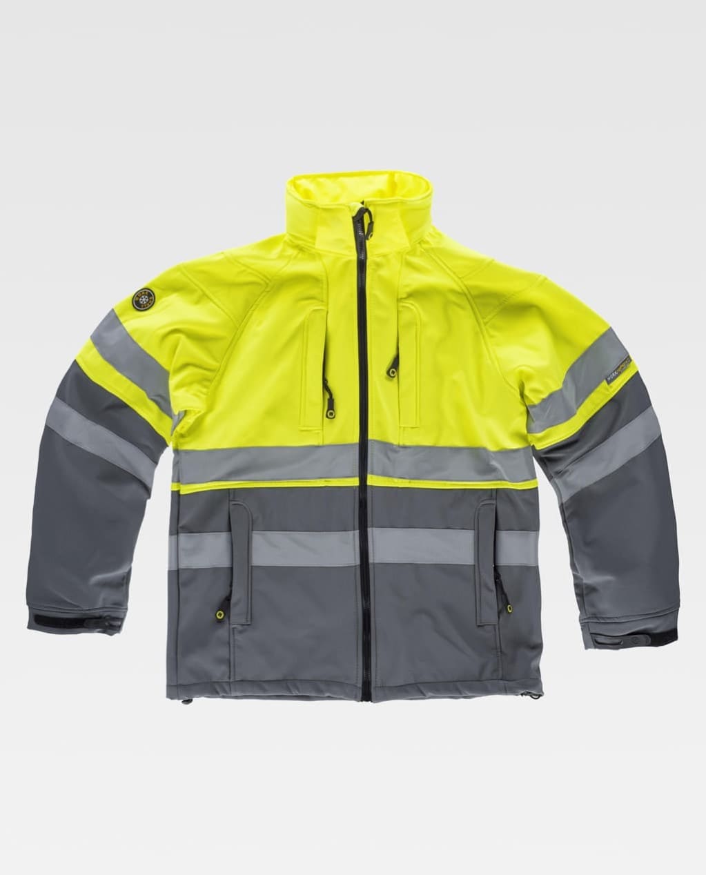 Chaqueta Workshell combinada con cintas reflectantes. Parte superior de alta visibilidad. Cuello alto y capucha enrollable con cordón para ajustar. Cierre de cremallera. Solapa protectora interior vuelta en la parte superior cubriendo la cremallera. Dos bolsos de pecho y dos laterales interiores con cremallera. Dos cintas reflectantes en pecho, espalda y mangas.