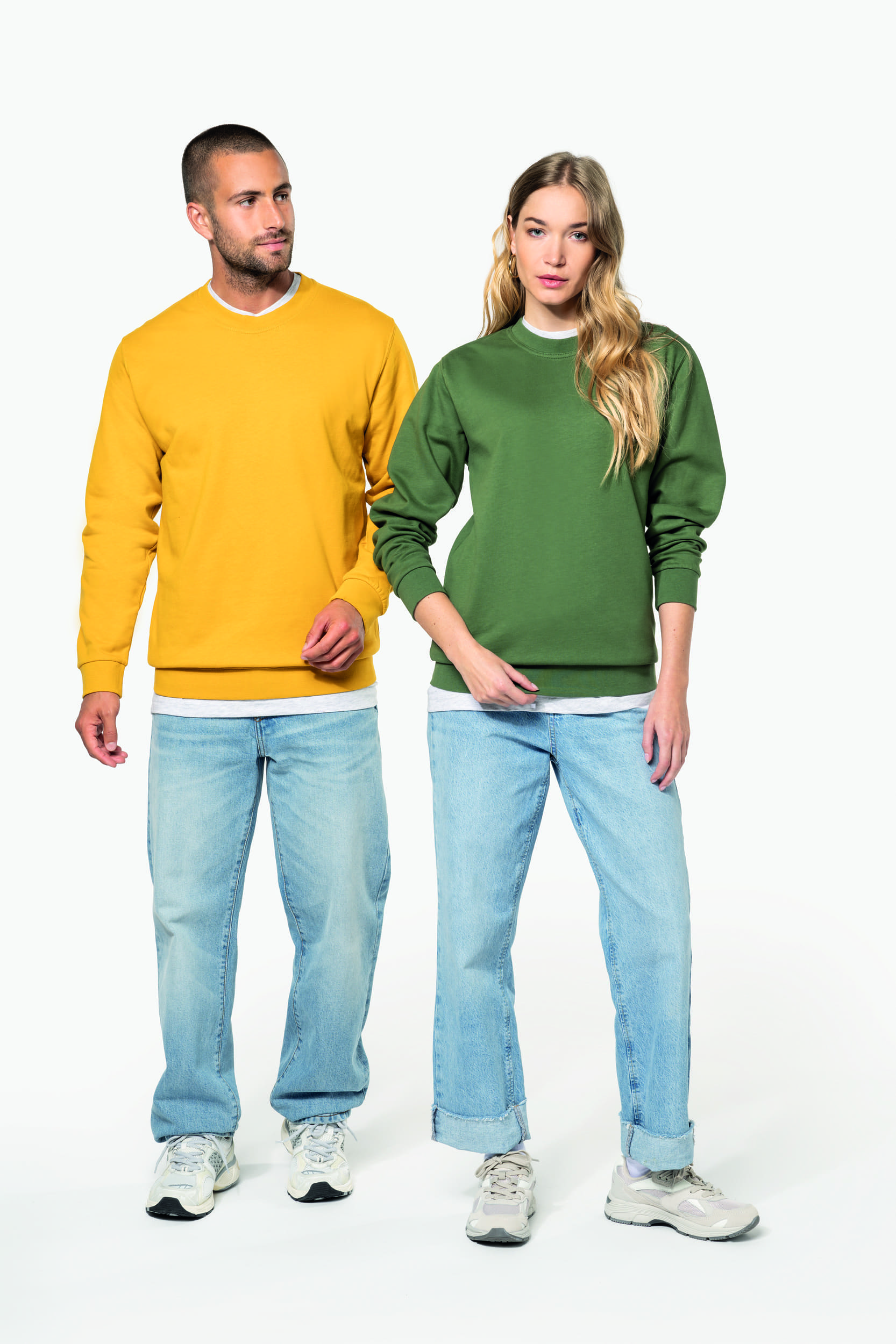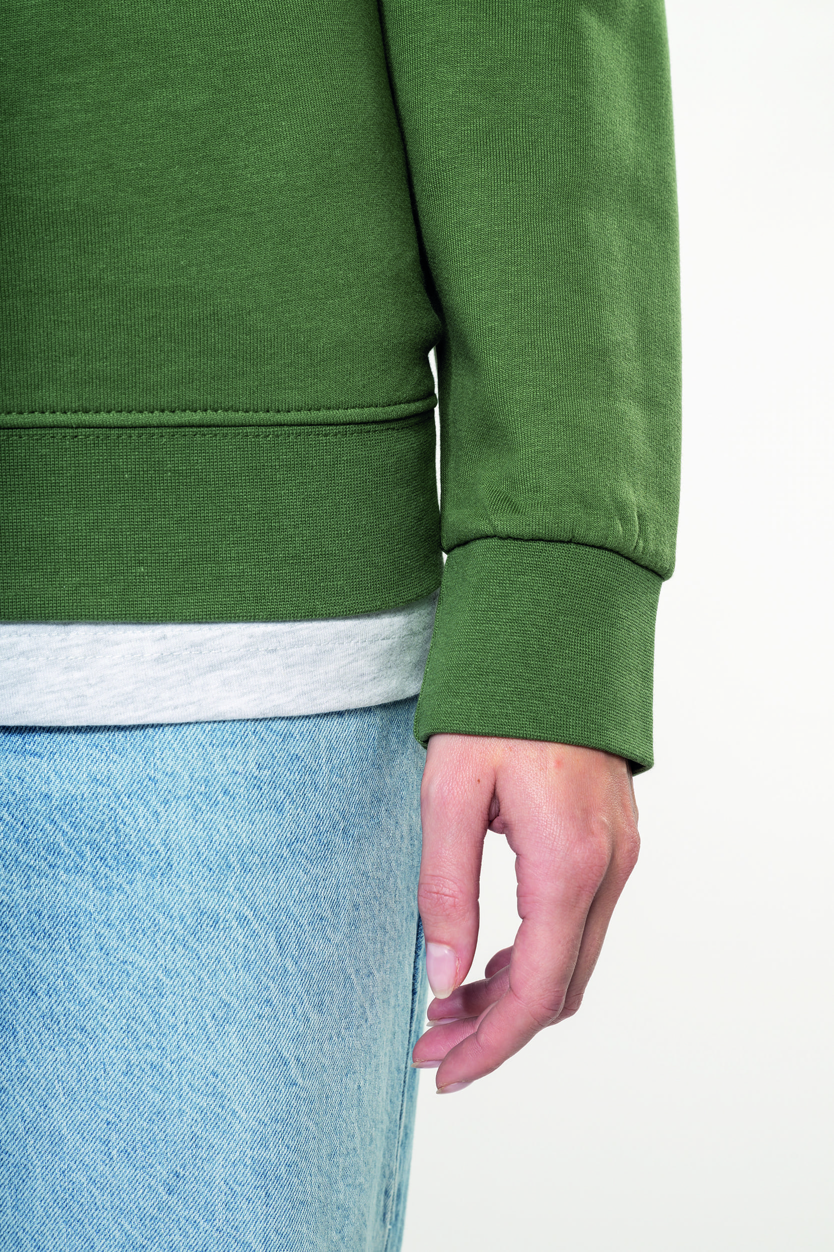 80 % algodón / 20 % poliéster. Algodón peinado. Felpa perchada. Mangas montadas. Acabados en canalé en el cuello, puños y bajo de la prenda.